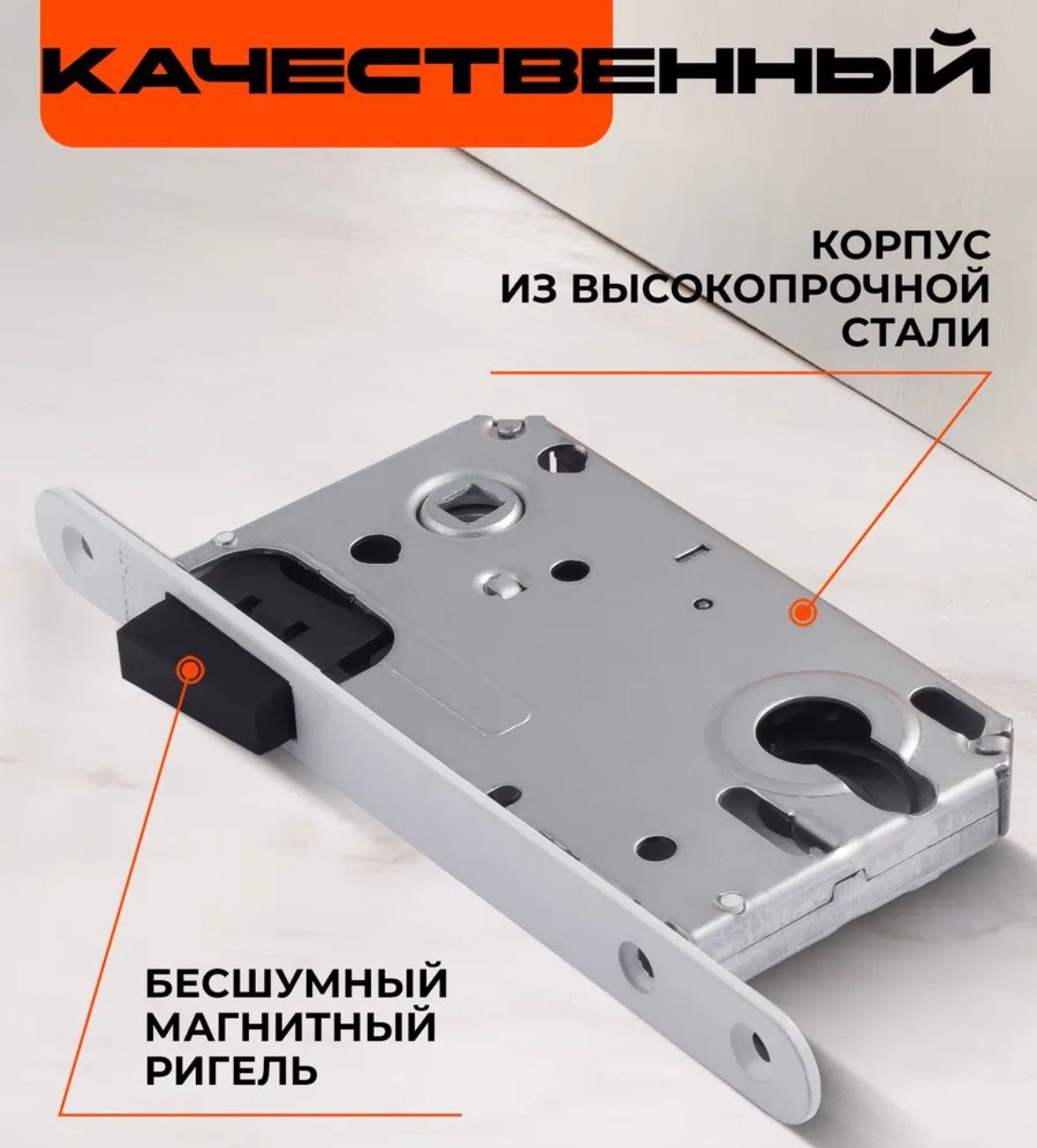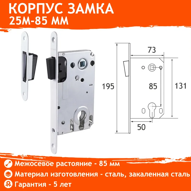Корпус замка предназначается для деревянных межкомнатных дверей, для комплектации с цилиндровым механизмом секретности, накладкой под цилиндр и ручкой. Корпус изготовлен из стали, имеет порошковое покрытие. Межосевое расстояние – 85 мм.