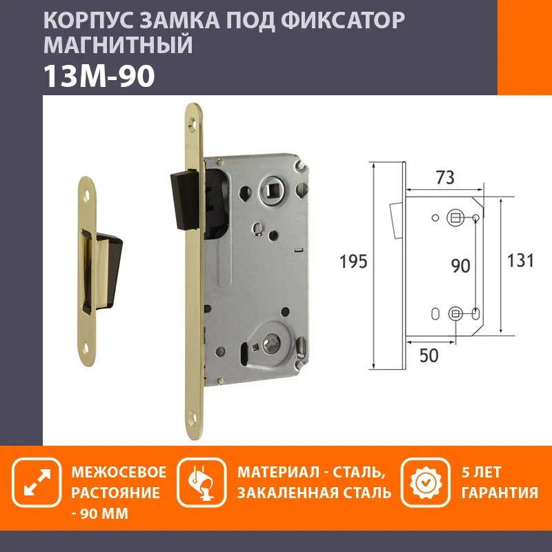 Корпус замка магнитный предназначается для установки на межкомнатные деревянные двери, в комплекте с ручкой на розетке и накладкой под фиксатор. Межосевое расстояние составляет 90 мм, расположение ригеля верхнее. Размеры отверстий стандартные: под ручку – 8х8 мм, под фиксатор – 6х6 мм.