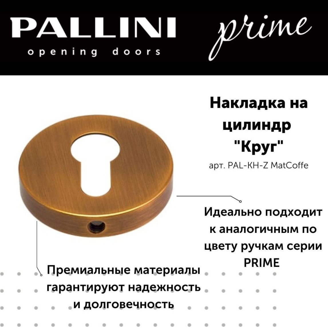 Комплект декоративных накладок (в комплекте 2 шт, одна устанавливается с наружной стороны двери, другая с внутренней) устанавливается в паре с дверной ручкой на дверной замок цилиндровый. Подавляющее большинство цилиндровых запирающих механизмов по размерам идеально сочетаются с технологическими отверстиям под цилиндр на декоративных накладках. Декоративная накладка под цилиндр на круглой розетке Pallini PAL-KH-Z MatCoffe кофе матовый подходит для дверных ручек Pallini серии Prime на круглом основании в аналогичном цвете.