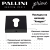 Комплект декоративных накладок (в комплекте 2 шт, одна устанавливается с наружной стороны двери, другая с внутренней) устанавливается в паре с дверной ручкой на дверной замок цилиндровый. Подавляющее большинство цилиндровых запирающих механизмов по размерам идеально сочетаются с технологическими отверстиям под цилиндр на декоративных накладках. Декоративная накладка под цилиндр на квадратной розетке Pallini PAL-KH-Z-S MatBlack черный матовый подходит для дверных ручек Pallini серии Prime на квадратном основании в аналогичном цвете.