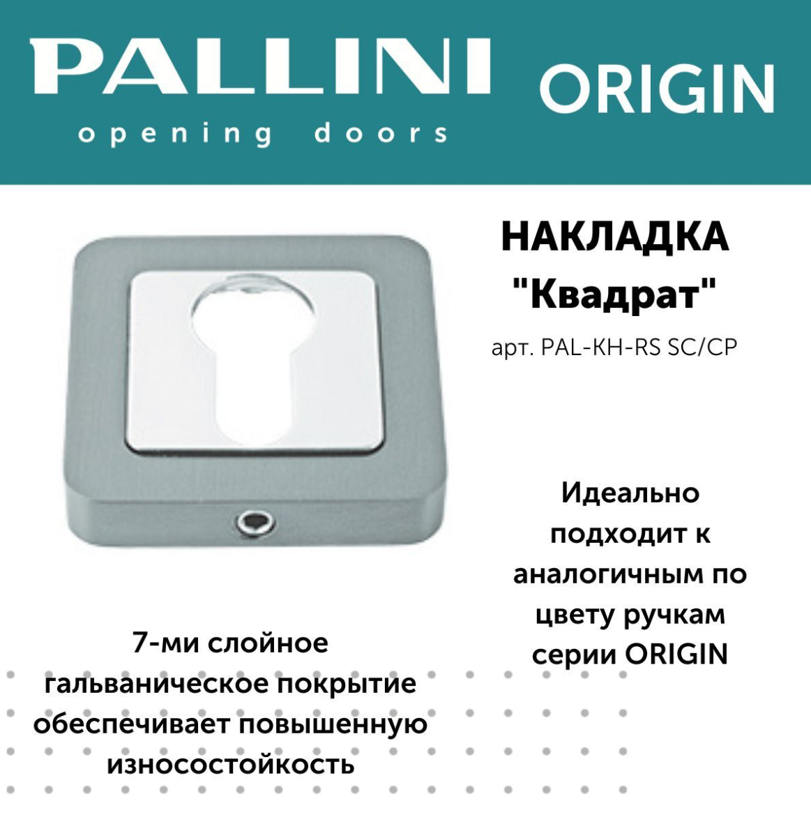 Комплект декоративных накладок (в комплекте 2 шт, одна устанавливается с наружной стороны двери, другая с внутренней) устанавливается в паре с дверной ручкой на дверной замок цилиндровый. Цилиндровые запирающие механизмы по размерам идеально сочетаются с технологическим отверстием под цилиндр на декоративных накладках. Декоративная накладка под цилиндр на квадратной розетке PAL-KH-RS SC/CP хром матовый подходит для дверных ручек Pallini серии Origin на квадратном основании в аналогичном цвете.