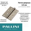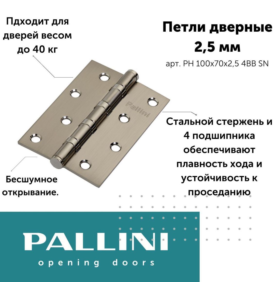 Универсальная врезная петля PALLINI изготовлена из стали. Предназначена для установки на деревянные межкомнатные двери, подходит для дверей правого и левого открывания. Гальваническое покрытие прошло тест на устойчивость к коррозии в соляном тумане – более 96 часов, что соответствует высшему 4 классу стойкости покрытия. В петлях с врезкой установлены четыре внутренних подшипника и стальной стержень, что обеспечивает мягкость хода, устойчивость к проседанию (смещению) и сохранение потребительских свойств в течение длительного периода времени. Максимальная нагрузка на 2 петли 40 кг, на 3 петли 50 кг. Размер петли: 100×70х2,5. Саморезы в комплекте.