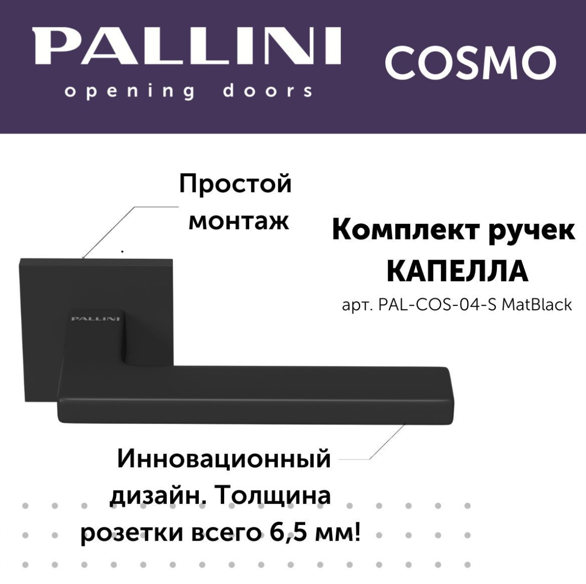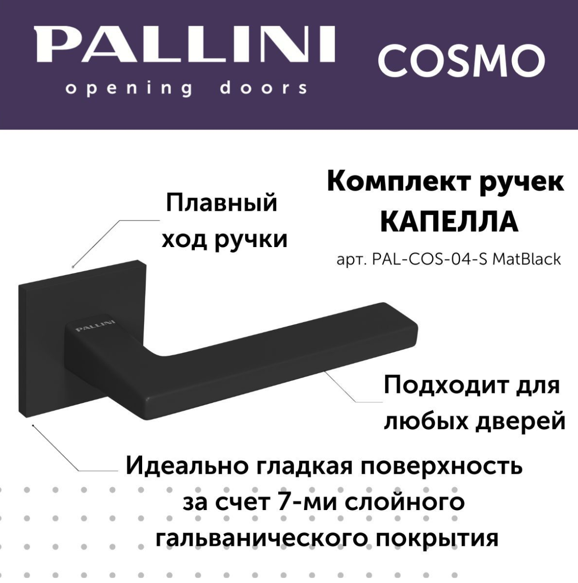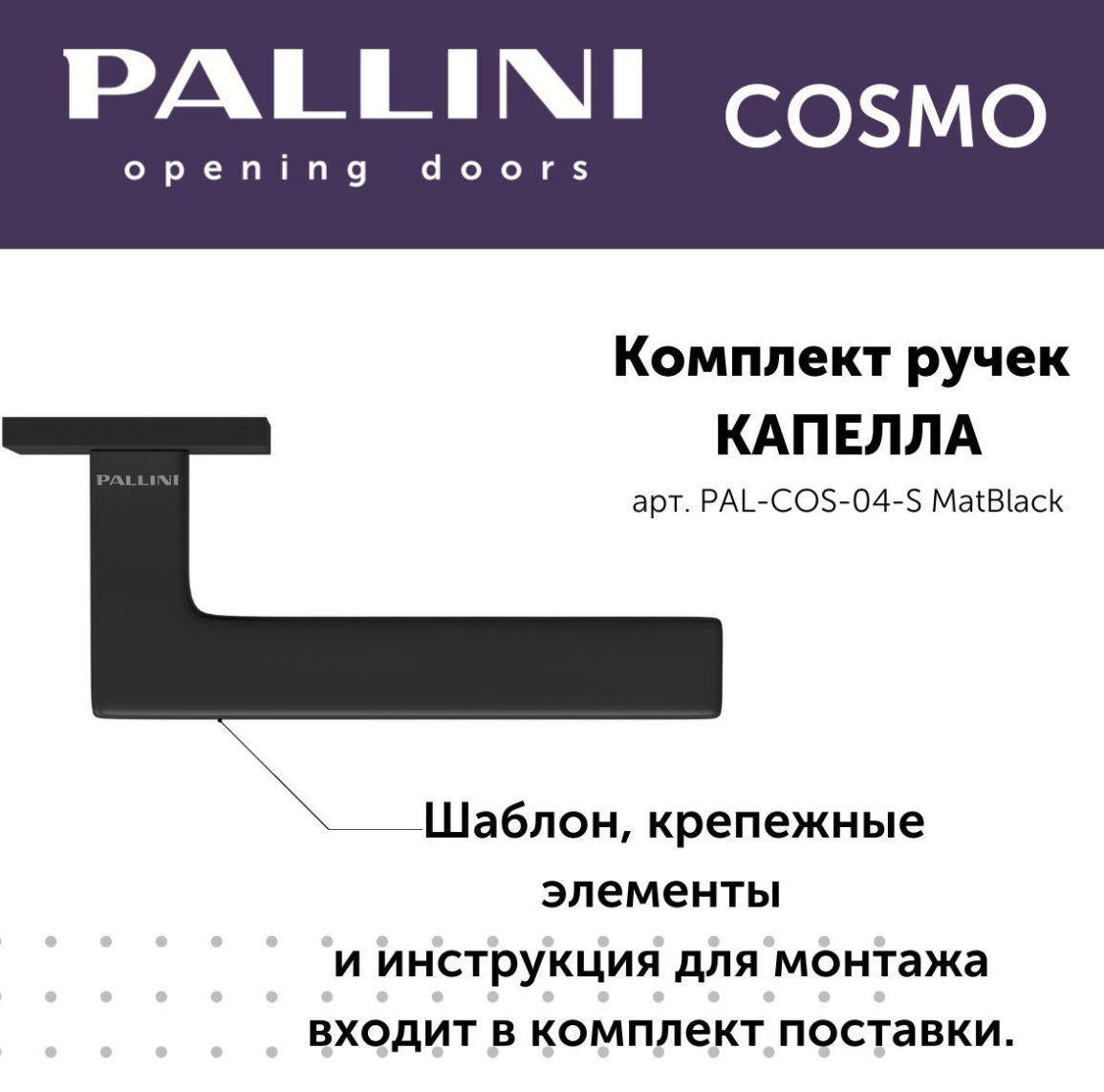 Будьте первым, кто оставил отзыв на “Ручка дверная Pallini Cosmo на квадратной розетке 6 мм “Капелла” PAL-COS-04-S MatBlack черный матовый”