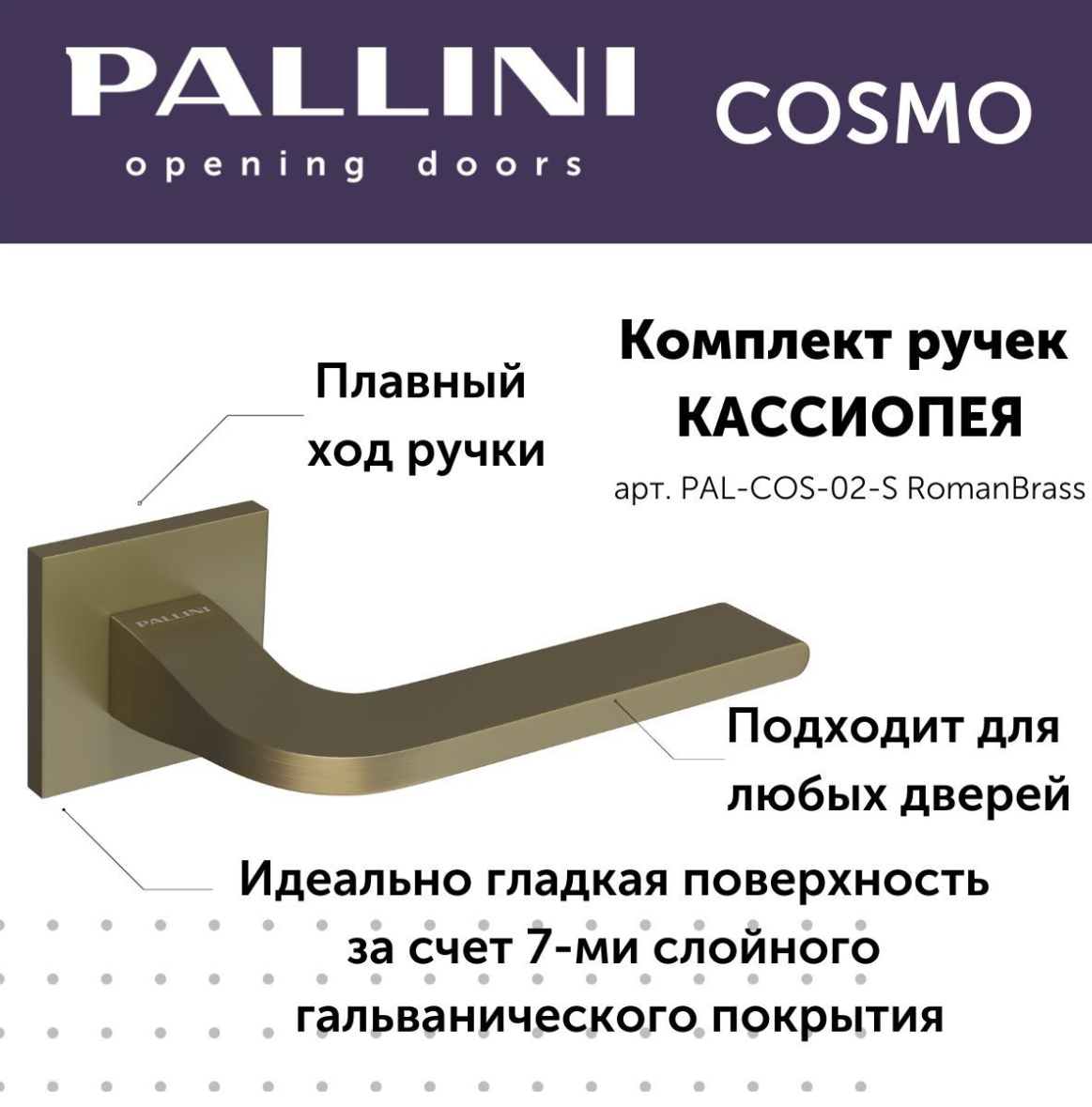 Кассиопея – мать Андромеды, согласно греческой мифологии вступила в спор с морскими божествами утверждая, что является самой красивой. Возможно за это или по какой другой причине, была помещена на небо в виде созвездия. Утонченность и изящество дверных ручек Паллини из серии Cosmo воплощено в тонкой 6-и мм розетке. Легкость формы сочетается с твердостью сплава из которого изготовлена дверная ручка на квадратном основании “Кассиопея”. Цвет ручки: латунь римская.