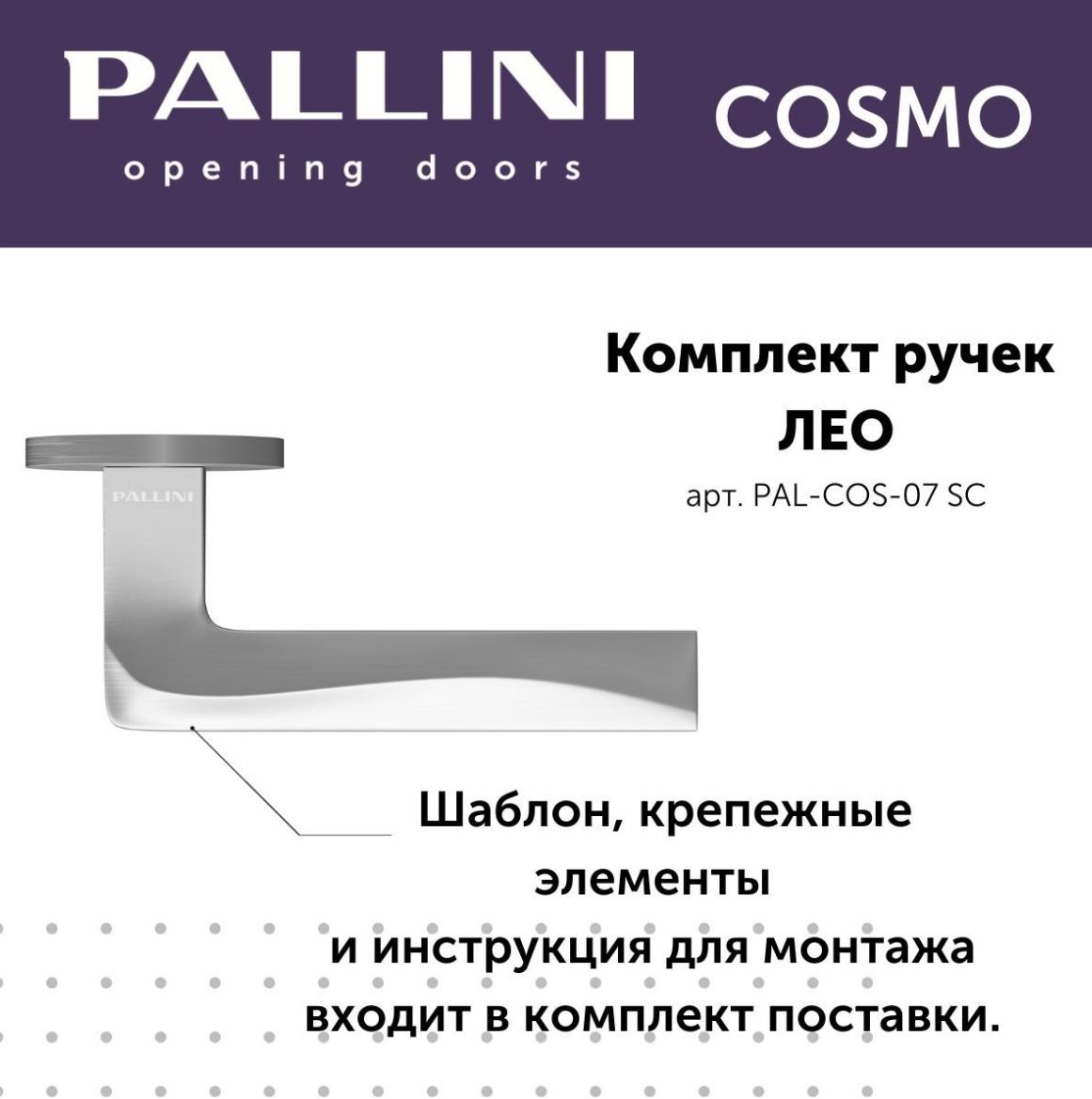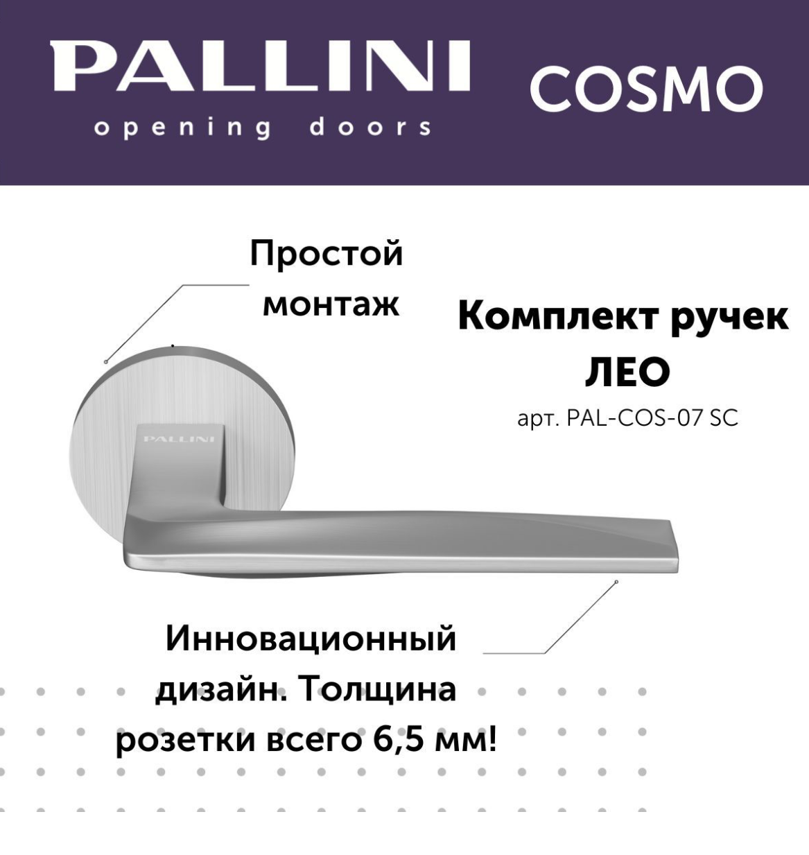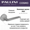 Дверная ручка Pallini “Лира” из коллекции Cosmo обладает изысканностью форм и линий. Ручка на тонкой розетке Лира одинаково хорошо смотрится как на межкомнатных дверях классического стиля, так и на современных царговых дверях с различными видами покрытий. Утонченность и изящество дверных ручек Паллини из серии Cosmo воплощены в тонкой 6-и мм розетке. Легкость формы сочетается с твердостью сплава из которого изготовлена дверная ручка на круглом основании “Лео”. Цвет ручки: хром матовый