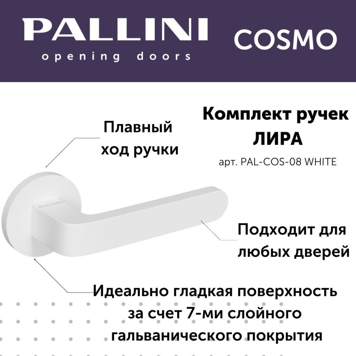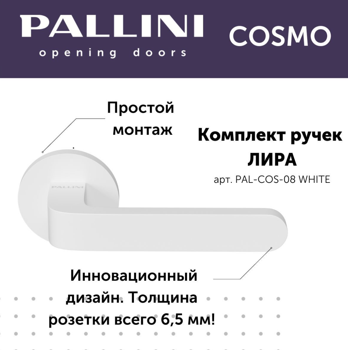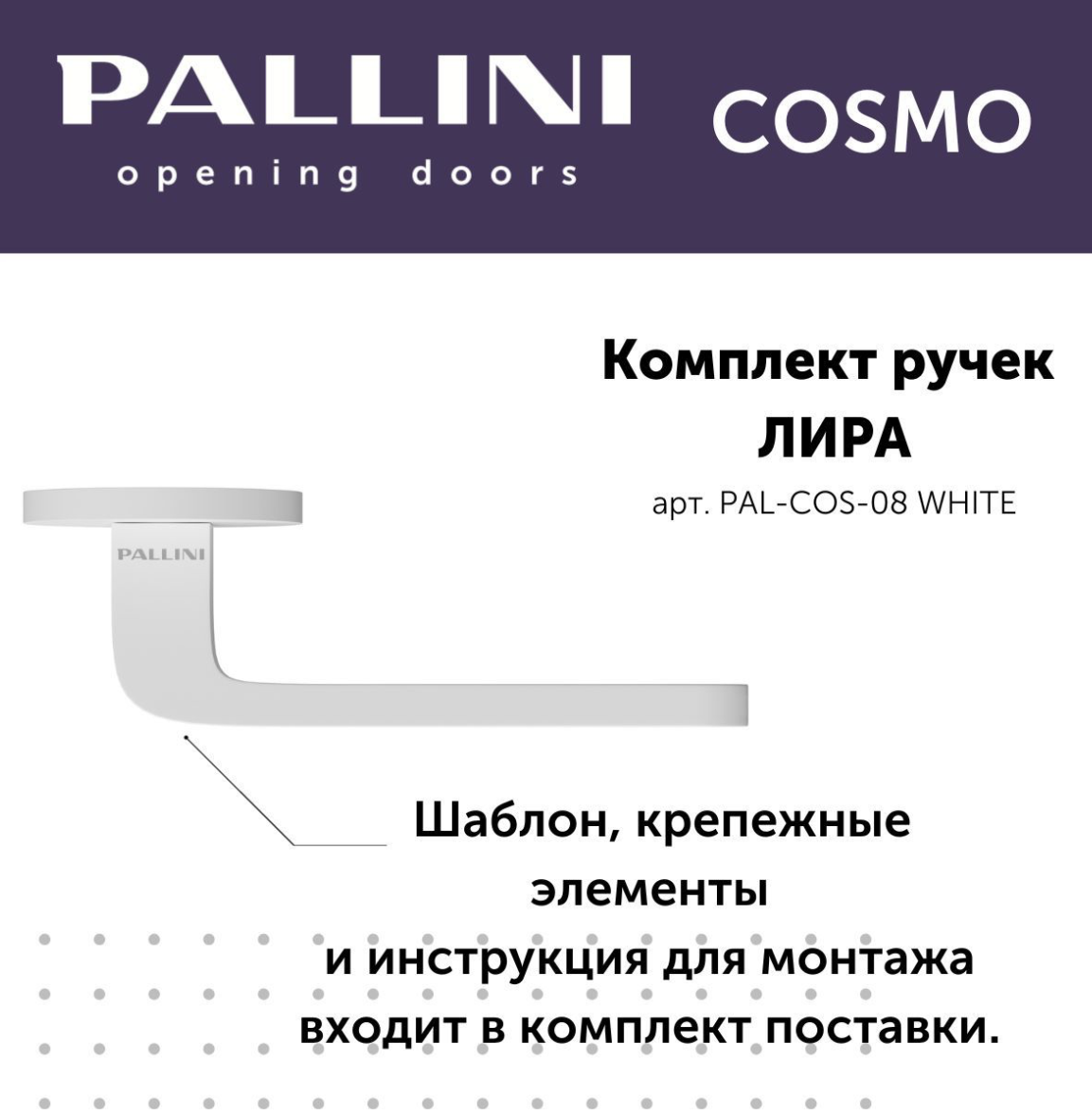 Будьте первым, кто оставил отзыв на “Ручка дверная Pallini Cosmo на круглой розетке 6 мм “Лира” PAL-COS-08 WHITE белый”