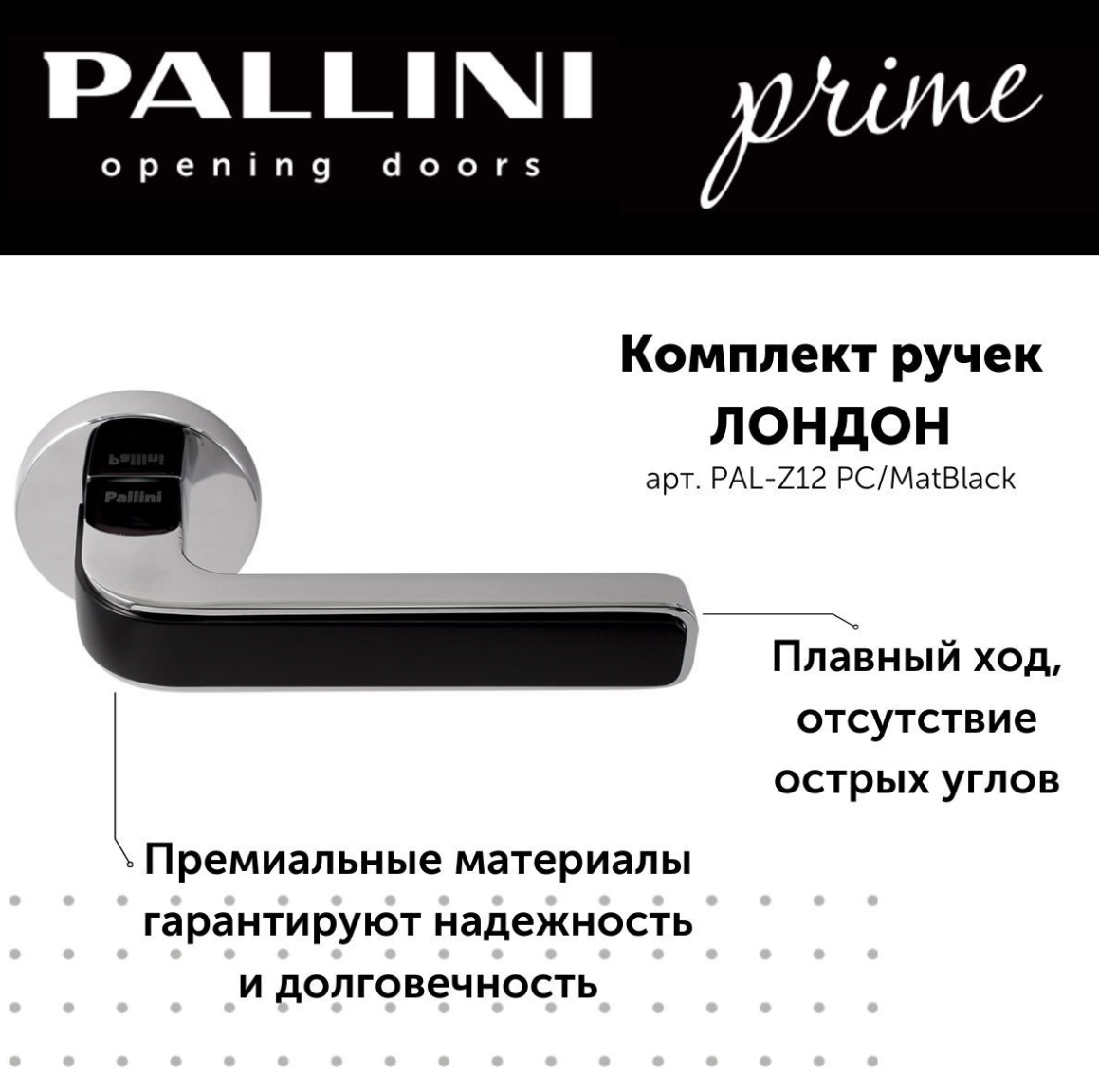 PALLINI PRIME – премиальная серия дверных ручек торговой марки Pallini. Как жители Лондона любят разукрашивать фасады в интересные цвета, так и технологи компании Pallini решили дополнить ручку “Лондон” цветными вставками. А ещё эта модель имеет как круглую, так и квадратную основу. Дверная ручка “Лондон” на круглой розетке отлично впишется в любой интерьер. Цвет ручки: хром полированный/черный матовый.