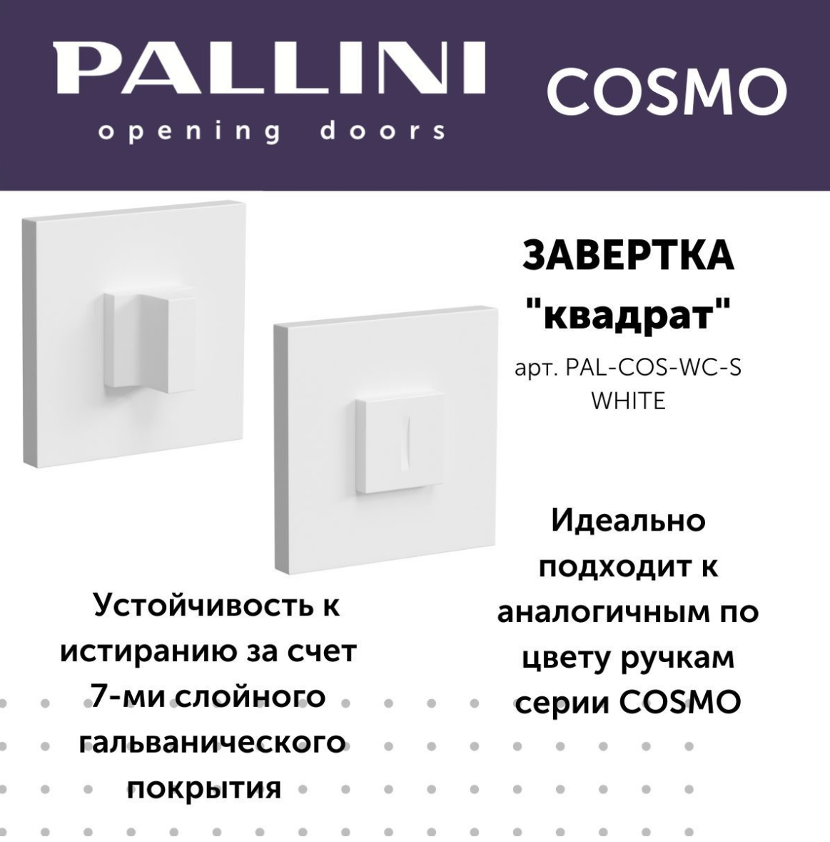 Завёртка сантехническая (поворотная ручка) устанавливается вместе с дверной ручкой на сантехнический замок (сантехническая защелка) на дверях где требуется временно ограничить доступ к помещению изнутри. Например, ванная комната или туалет. Сантехнические завёртки Pallini комплектуются квадратом 6*6 мм, что позволят их применять на подавляющем большинстве сантехнических защелок, которые имеют соответствующее технологическое отверстие как раз под квадрат 6*6 мм. Завёртка (поворотная ручка) квадратная Pallini Cosmo PAL-COS-WC-S WHITE белый подходит для дверных ручек Pallini серии Cosmo на квадратном основании в аналогичном цвете.
